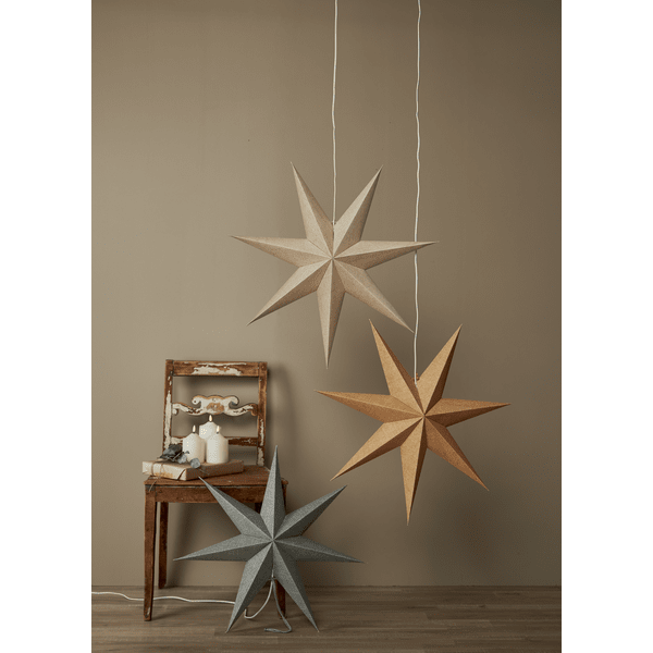 Estrella de papel forrada en tela dorada para un aspecto especialmente natural. Una moderna estrella de Adviento para decorar una ventana o apoyarla contra una pared. Ideal para la temporada de Adviento y como una hermosa estrella de Navidad. No incluye accesorios para colgar ni bombilla.