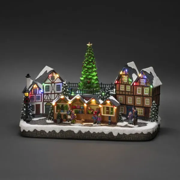 ¡Crea un paraíso invernal viviente en tu hogar con este mercado navideño mecánico! Con 28 luces LED de color blanco cálido, casas cubiertas de nieve, puestos de mercado coloridos y un majestuoso árbol de Navidad en el centro, difunde luz y música. ¡Una decoración atmosférica que recuerda la magia clásica navideña! Funciona con 3 pilas AA (1,5 V, no incluidas). Transformador con cable negro de 1,8m de longitud y enchufe incluido. Iluminación LED integrada.
