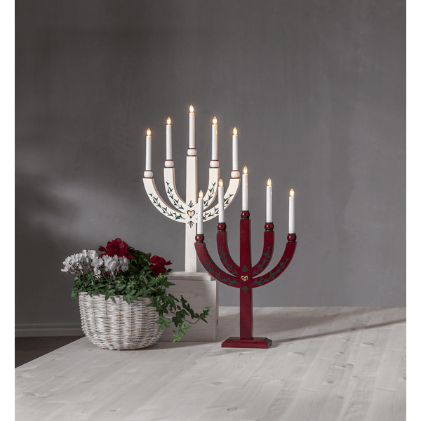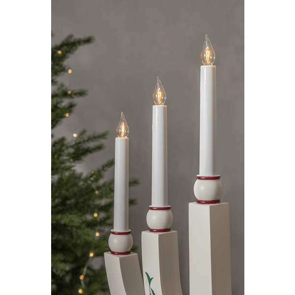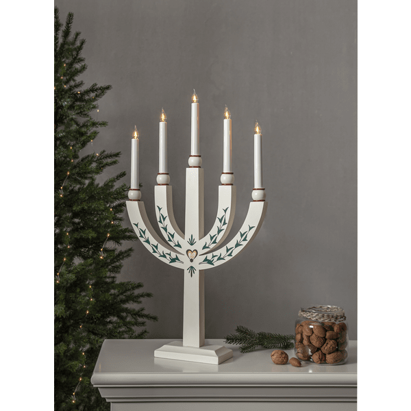 Candelero tradicional de madera con finos detalles. El candelabro de Adviento tiene 5 fuentes de luz que le dan al candelabro una iluminación acogedora y un ambiente navideño hogareño. Colóquelo en la ventana o en una botella. Viene con cable blanco de 1,8 m, interruptor de encendido y enchufe. Incluye 5 bombillas E20 reemplazables (55 V).