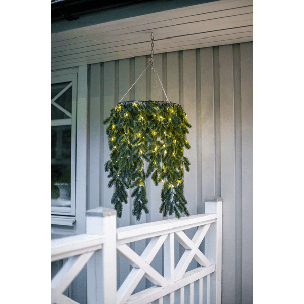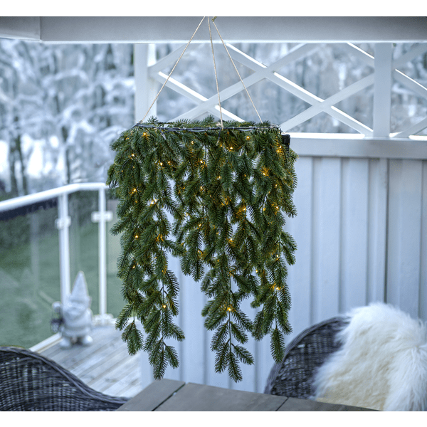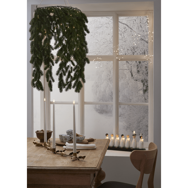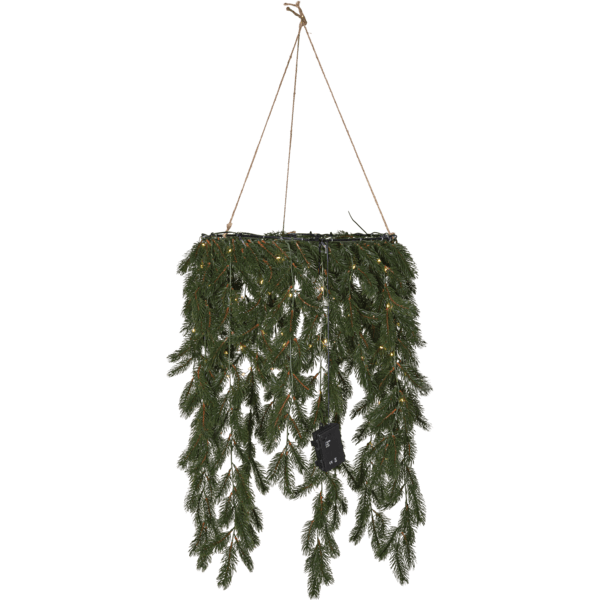 Erna es una hermosa corona con agujas de color verde oscuro hecha de material PE que luce muy natural. Esta guirnalda cuelga horizontalmente y está iluminada con 80 LED de color blanco cálido con forma de gota de rocío. Se puede utilizar tanto en interiores como en exteriores. Funciona con 3 pilas AA y tiene un temporizador incorporado (6 horas encendido, 18 horas apagado, repetición). Pilas no incluidas. Viene con un cable de 30 cm de largo hasta el compartimento de la batería.