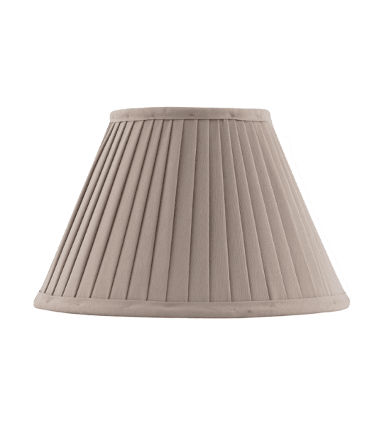 Pantalla textil clásica confeccionada en tejido de algodón plisado con dobladillo anular para una fácil fijación. Portalámparas con rosca o en casquillo de latón incluido en las lámparas de mesa y de pie de Karlskrona Lampfabrik. Montura: Lyra con orificio de 45mm.