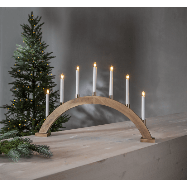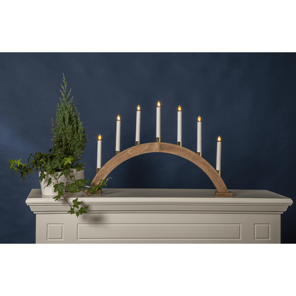 Candelero de madera abovedado, teñido de marrón, con candelabros bañados en latón. Hermoso candelabro de Adviento para decorar en Navidad. Viene con cable blanco de 1,8 m, interruptor de encendido y enchufe. Incluye 7 bombillas E10 reemplazables (34 V).