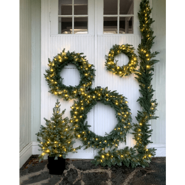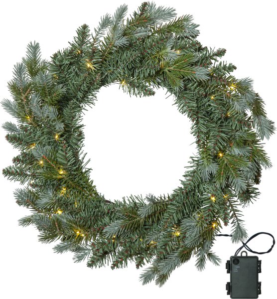 La corona de Greyland mide aproximadamente 55 cm de diámetro. Consiste en una mezcla de puntas de PE y puntas de PVC con un hermoso aspecto brillante de color verde verdoso. Con 40 pequeños puntos de luz de color blanco cálido, proporciona una hermosa iluminación tanto en interiores como en exteriores. El bucle puede estar iluminado de forma continua o configurarse con un temporizador para que esté encendido durante 6 horas, se apague durante 18 horas y se vuelva a encender al día siguiente. La alimentación se realiza mediante 3 pilas AA, que no están incluidas en la entrega. La misma familia también incluye abetos, coronas de varios tamaños y una guirnalda.