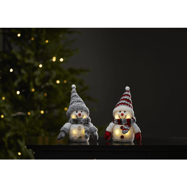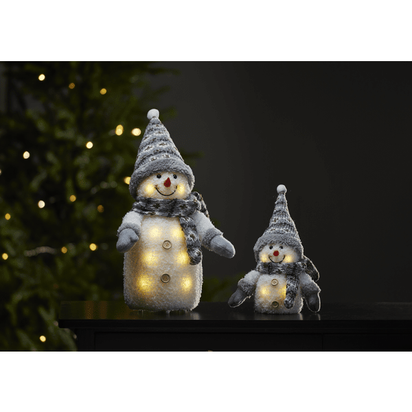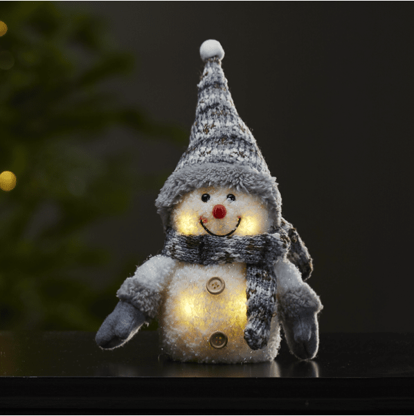 Figura decorativa a pilas con forma de acogedor muñeco de nieve con iluminación LED. Una hermosa decoración que difunde el espíritu navideño por toda la casa. Funciona con 3 pilas AAA, no incluidas.