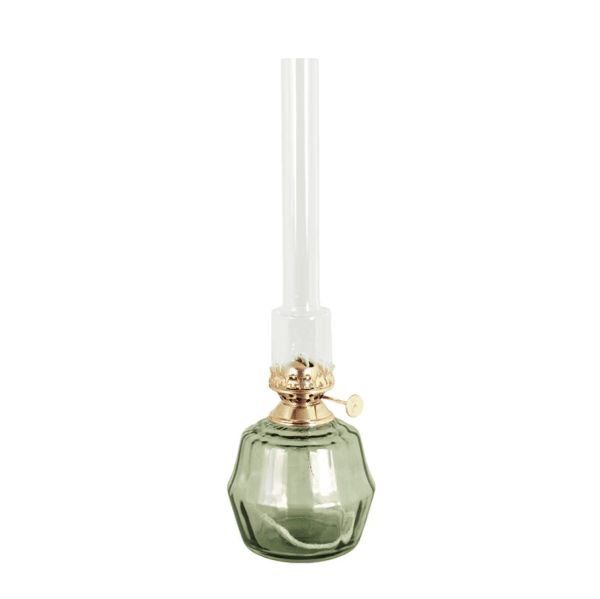 Lámpara de queroseno de vidrio verde tintado, que crea un hermoso tono a la vez que conserva su superficie transparente. El quemador es de vidrio transparente y latón. Incluye mecha. Compatible con la mecha número 116210 y los quemadores con los números 121810G y 139420G. Utilice siempre aceite para lámparas Strömshaga (número 100001) con esta lámpara de aceite, que se vende por separado.