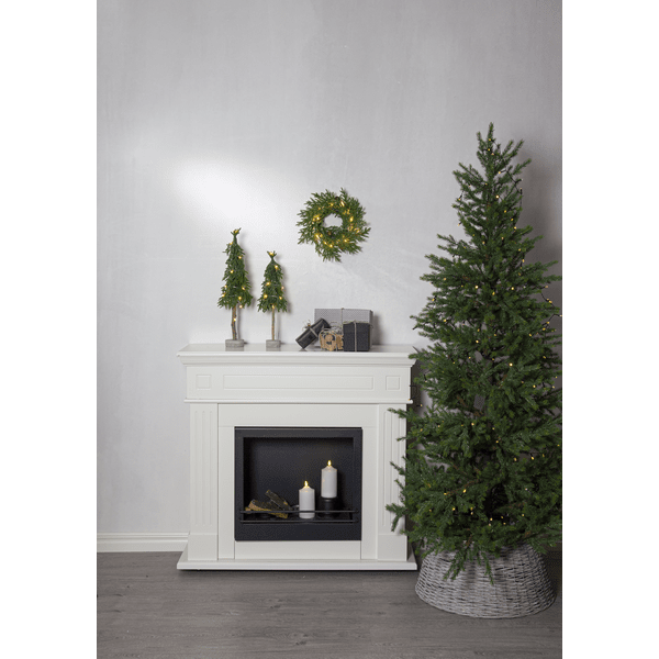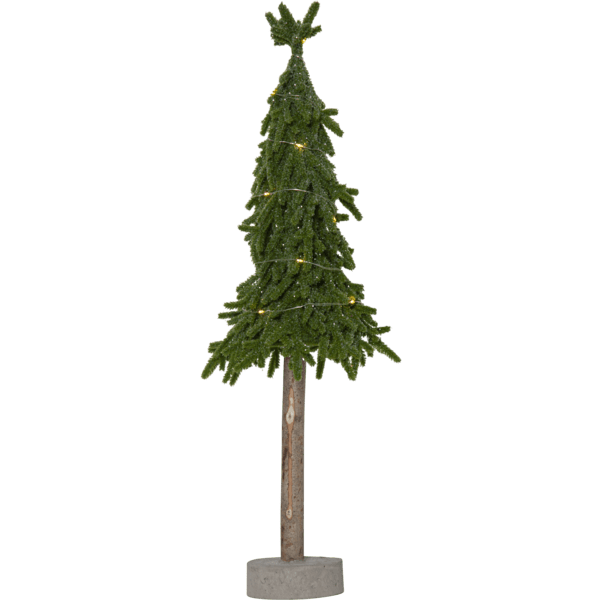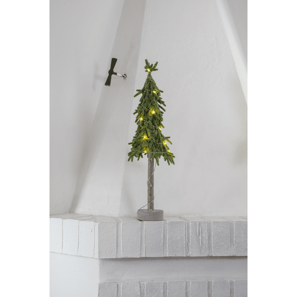 Pequeño árbol de Navidad decorativo de sobremesa, hecho de polietileno con un toque de purpurina y una robusta base de cemento. El árbol se ilumina con 15 pequeños LED de color blanco cálido. Colócalo en una mesa auxiliar, debajo del árbol de Navidad o como decoración en la mesa del comedor. Incluye un cable de 30 cm al compartimento de las pilas. El árbol funciona con 2 pilas AA (no incluidas). Duración de la iluminación: aprox. 200 horas.