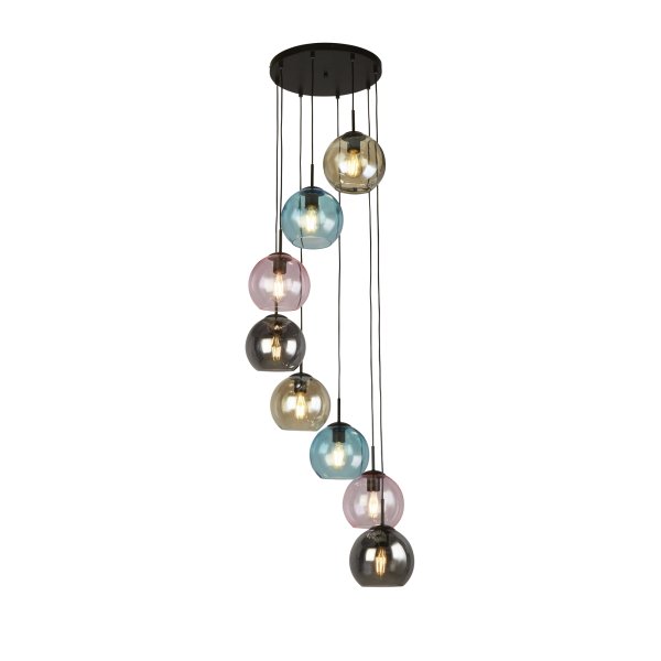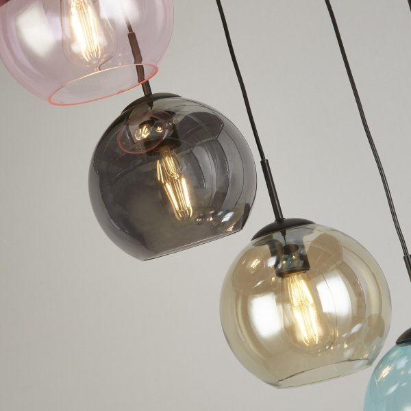 Mardi Gras combina una forma atemporal con una energía colorida: ¡una mezcla perfecta para quienes quieren darle vida a su espacio! Con sus seis cúpulas de cristal en azul, amarillo, rosa y gris ahumado, crea una impresión divertida y al mismo tiempo elegante. La lámpara está hecha de acero resistente y vidrio con una superficie brillante que refleja la luz y proporciona brillo adicional. Las formas redondas proporcionan una luz suave y agradable y, al mismo tiempo, son un verdadero punto de atracción, ya sea colgadas en el pasillo, en la sala de estar o encima de una mesa de comedor. La altura es ajustable para que puedas adaptarla fácilmente a la habitación y al estado de ánimo deseado. Fuentes de luz no incluidas.