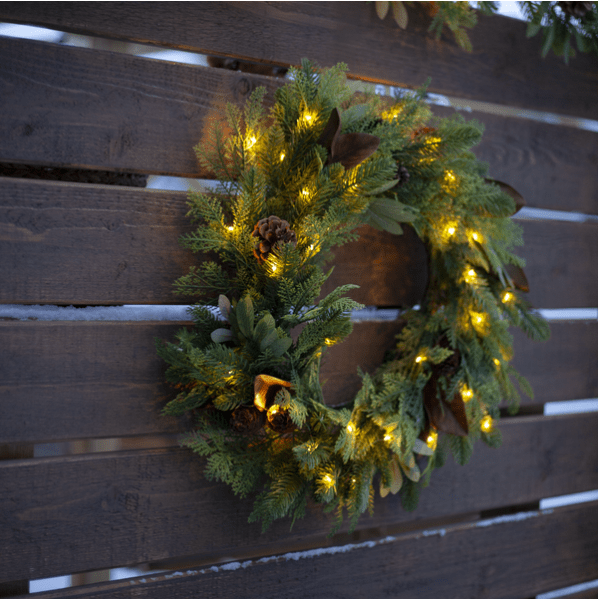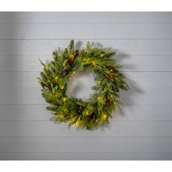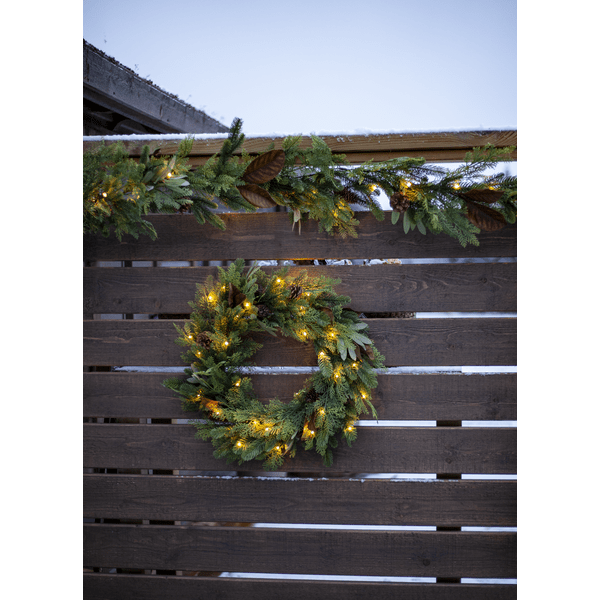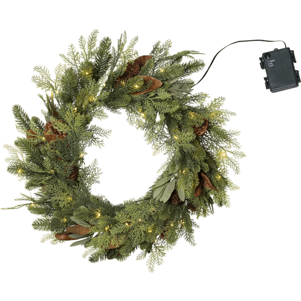 La corona Mixi está hecha de una mezcla de hojas y agujas de polietileno. Treinta LED blancos cálidos en forma de lágrima proporcionan una luz cálida y agradable. Apta tanto para interiores como para exteriores, la corona es una hermosa decoración para puertas y paredes. Cuenta con un temporizador (6 horas de encendido, 18 horas de apagado y repetición). Un cable de 30 cm llega al compartimento de las pilas. La corona funciona con 3 pilas AA (no incluidas). La duración de la iluminación es de aproximadamente 150 horas.