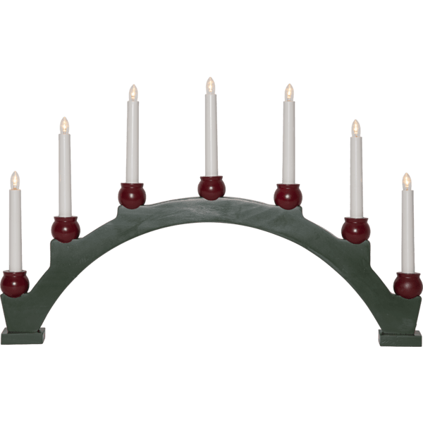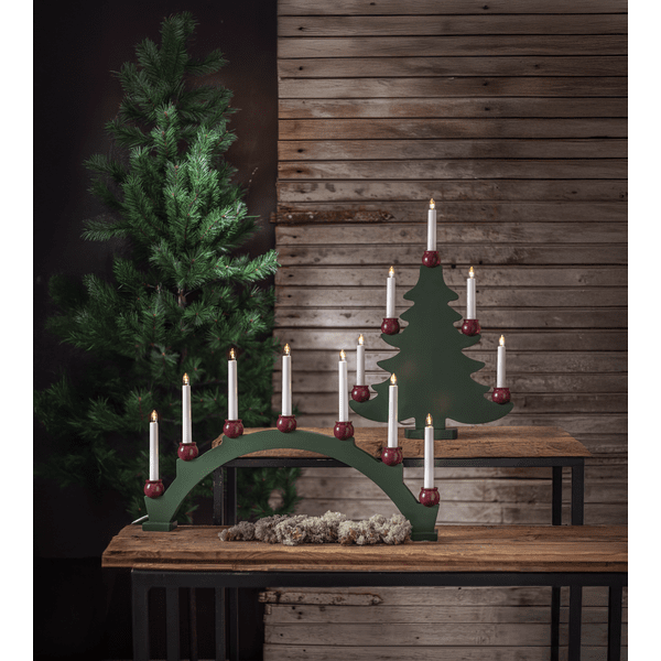 Candelabro de Adviento verde con una elegante forma arqueada. Cinco velas LED en candelabros rojos crean una luz acogedora y un efecto de iluminación tradicional. Lleve la alegría navideña a su ventana con este clásico candelero. Colóquelo en la ventana o en un aparador. Incluye un cable blanco de 1,8 m de largo, interruptor de encendido/apagado y enchufe. Contiene 7 bombillas LED E10 reemplazables.