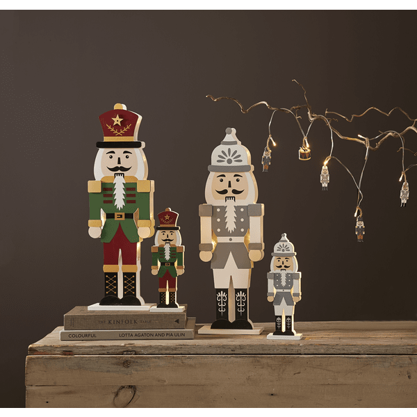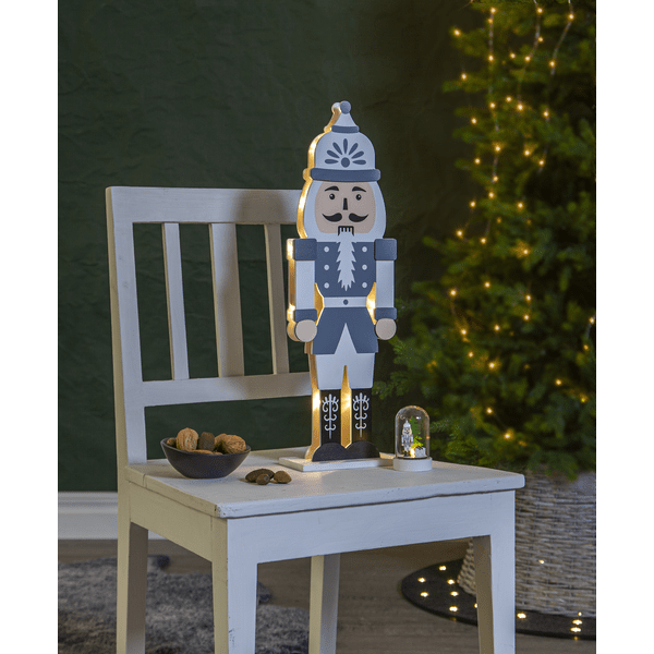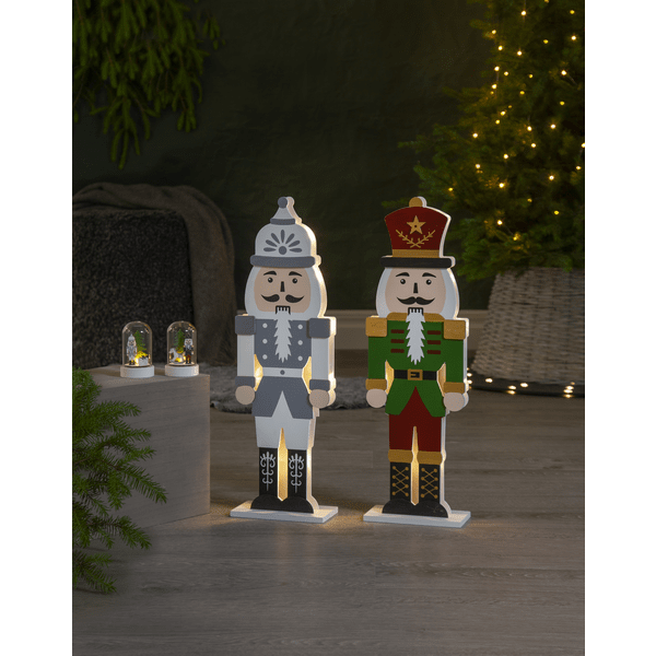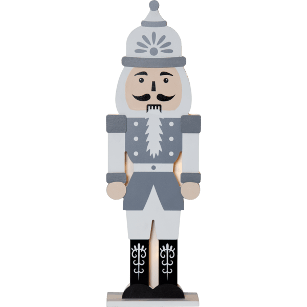 Elegante cascanueces de madera cortada a láser. La parte frontal está acabada en gris, blanco y negro. Pequeñas luces LED iluminan las dos siluetas recortadas, una frontal y otra trasera. Decora tu escritorio o estantería con este cascanueces durante Navidad y Adviento. Incluye temporizador (6 horas encendido, 18 horas apagado, repetición). Funciona con 2 pilas AA (no incluidas). Duración de la pila: 1000 horas.