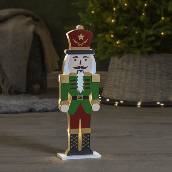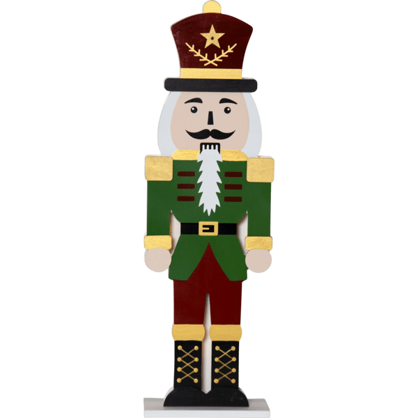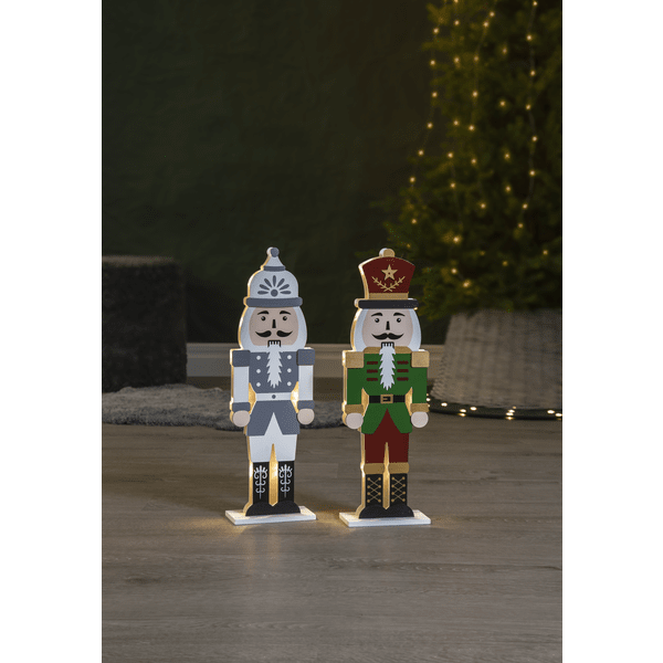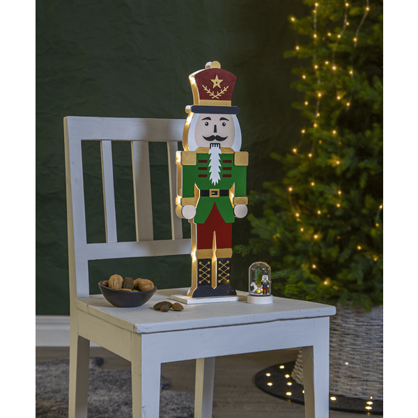 Elegante cascanueces de madera cortada a láser. La parte frontal está pintada en rojo, verde, dorado y negro. Pequeñas luces LED iluminan las dos siluetas recortadas: una frontal y otra trasera. Decora tu escritorio o estantería con este cascanueces durante Navidad y Adviento. Incluye temporizador (6 horas encendido, 18 horas apagado, repetición). Funciona con 2 pilas AA (no incluidas). Duración de la pila: 1000 horas.