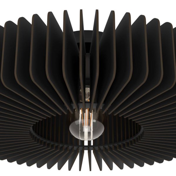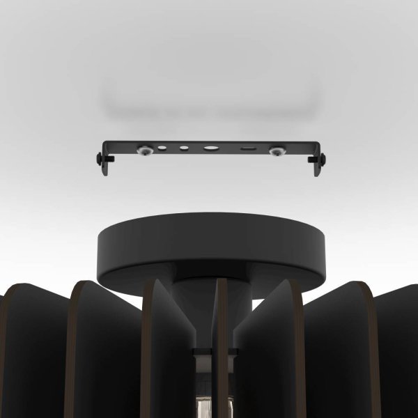 Haga una declaración de diseño audaz en su hogar con esta lámpara de techo única. La sofisticada construcción con listones negros crea un aspecto de madera llamativo y moderno que añade estilo a cualquier habitación. La fuente de luz está elegantemente centrada y difunde un brillo suave a través de las láminas, creando un efecto de iluminación dramático. Perfecto para salas de estar o comedores donde desea un punto focal visual. Diseñada con un enfoque en la durabilidad y la estética moderna, esta lámpara es a la vez un elemento destacado del diseño y una opción respetuosa con el medio ambiente.
