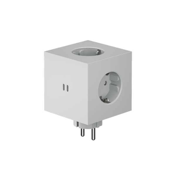 Extensión de enchufe de Avolt con un diseño elegante, un cubo de plástico reciclado y una placa magnética en la parte inferior para colgar en la pared. la pared. Tiene tres enchufes normales y dos; Entradas USB-C.